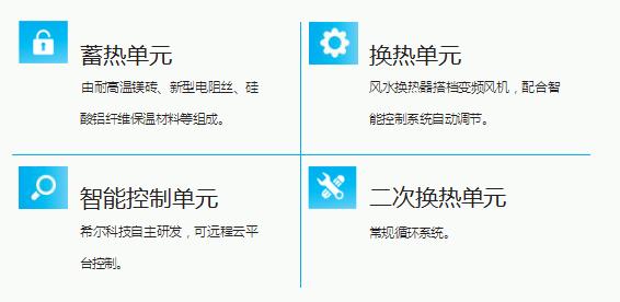 固体电蓄热设备在夜间将廉价的 低谷电能转化成热能进行储存,在白 天向用热单元供热,也可在夜间蓄热 的同时向用热单元供热。固体电蓄热 设备的储存效率可达到98%,储热介 质的工作温度范围可在80~850℃之 间。可根据用户实际供电情况选择 0.4kV、10kV、35kV、66kV设备电压 等级,按用户的实际供暖需求进行设 备定制。