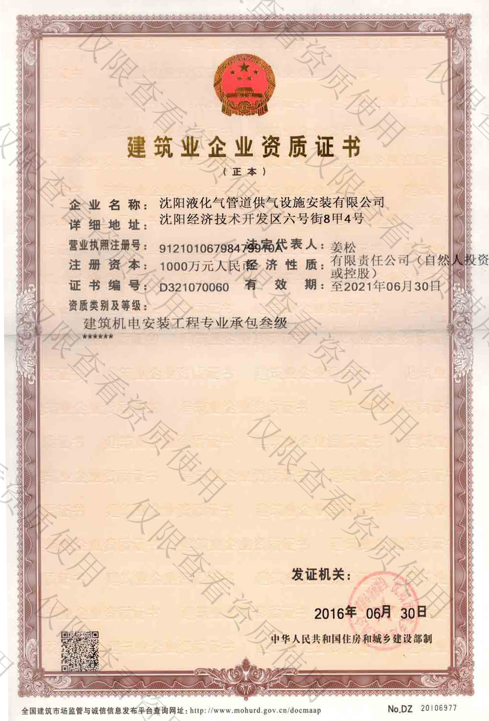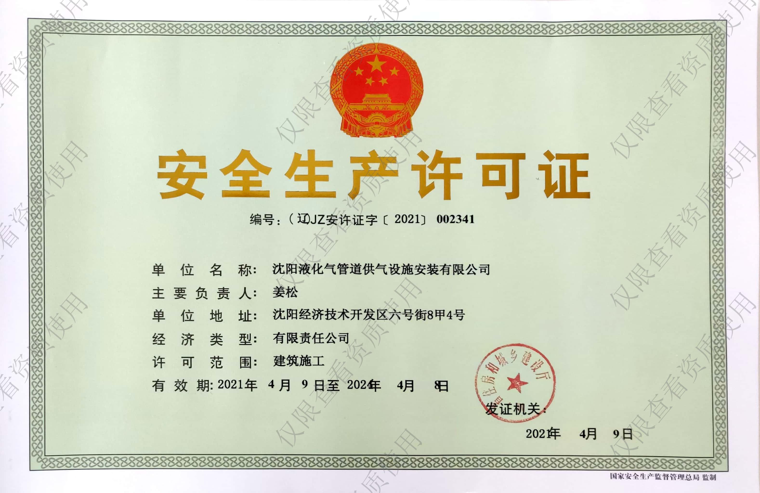 沈阳液化气管道供气设施安装有限公司成立于2007年04月19日,注册资金1000万元,公司总部位于沈阳市铁西区,办公面积1000多平方米,是东北地区最具专业性的机电设备安装公司之一。本公司持有建筑机电安装工程专业承包资质,特种设备生产许可证,GC2、GB1、GB2压力管道安装许可证,锅炉安装许可证,安全生产许可证,AAA级企业信用等级证书等一系列资质证书。公司于2021年顺利通过ISO9001:2015质量管理体系认证,ISO14001:2015环境管理体系认证,GB/T45001-2020职业健康安全管理体系认证,并持续运行保持。